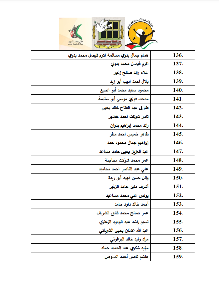 نشرت هيئة شؤون الأسرى والمحررين ونادي الأسير الفلسطيني ومكتب إعلام الأسرى أسماء الأسرى الفلسطينيين المحررين ضمن الدفعة الثانية من صفقة التبادل في المرحلة الأولى والتي تضم 200 أسير.