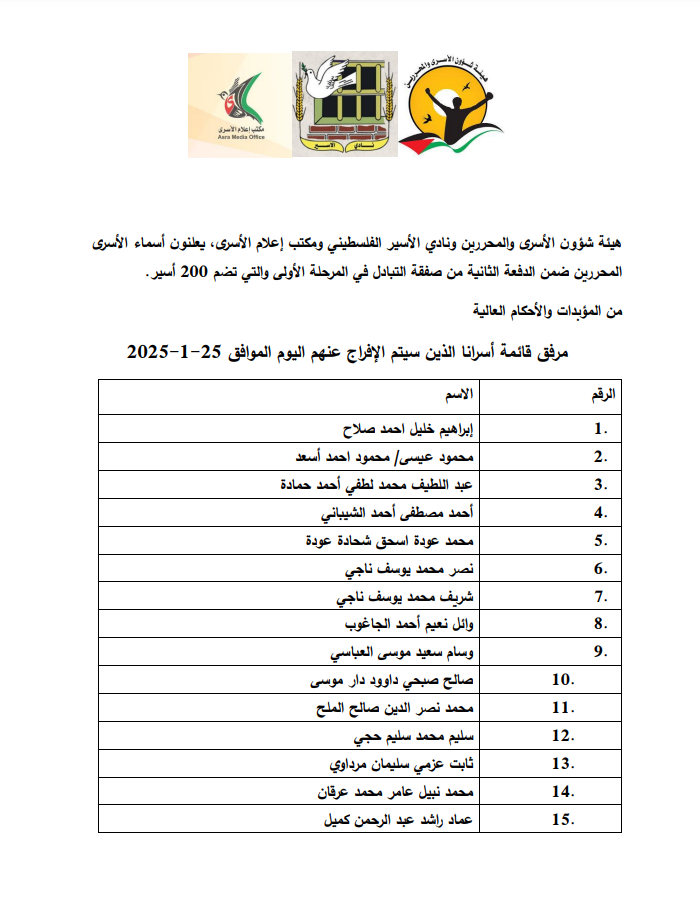 نشرت هيئة شؤون الأسرى والمحررين ونادي الأسير الفلسطيني ومكتب إعلام الأسرى أسماء الأسرى الفلسطينيين المحررين ضمن الدفعة الثانية من صفقة التبادل في المرحلة الأولى والتي تضم 200 أسير.