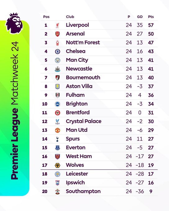 يتصدر ليفربول جدول الدوري الإنجليزي برصيد 57 نقطة بعدما خاض مباراته المؤجلة ضد إيفرتون يوم الأربعاء الماضي، والتي انتهت بالتعادل 2-2 قبل مباريات اليوم بالجولة الـ25.