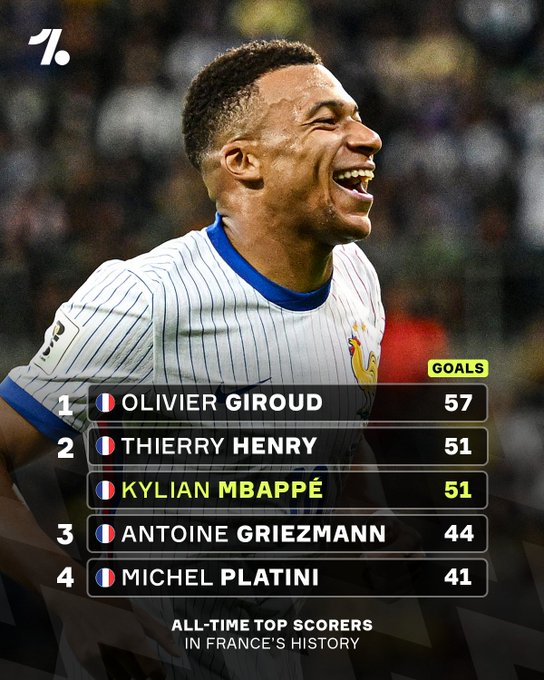 وبذلك سيكون مبابي (26 عاما) على بعد 6 أهداف فقط من معادلة الهداف التاريخي لمنتخب فرنسا، أوليفييه جيرو، مهاجم أرسنال وتشيلسي السابق الذي سجل 57 هدفا دوليا.