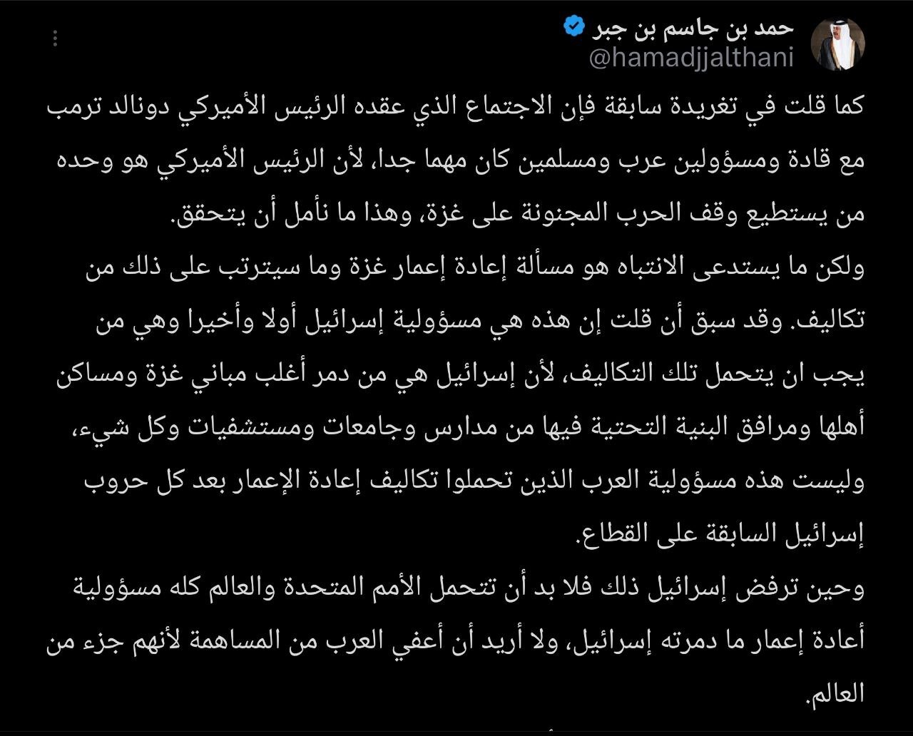 وأردف رئيس وزراء قطر الأسبق: “حين ترفض إسرائيل ذلك فلا بد أن تتحمل الأمم المتحدة والعالم كله مسؤولية أعادة إعمار ما دمرته إسرائيل، ولا أريد إعفاء العرب من المساهمة لأنهم جزء من العالم”.