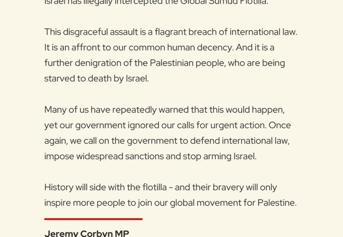 وجاء في بيان نشره كوربن في حسابه علي منصة “إكس”: “اعترضت إسرائيل بشكل غير قانوني أسطول الصمود الدولي، وهذا الاعتداء المشين انتهاك صارخ للقانون الدولي، وإهانة لإنسانيتنا المشتركة. كما أنه يمثل مزيدا من الإذلال للشعب الفلسطيني، الذي يتم تجويعه حتى الموت على يد إسرائيل”.
