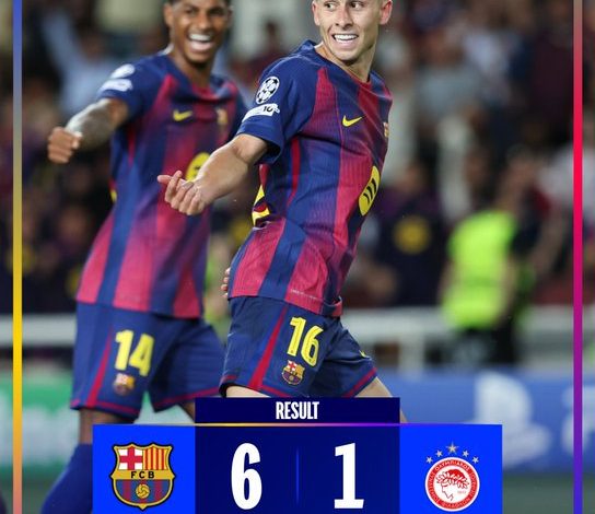دك فريق برشلونة الإسباني شباك ضيفه أولمبياكوس اليوناني بستة أهداف مقابل هدف واحد في اللقاء الذي جمعهما مساء اليوم الثلاثاء، في الجولة الثالثة من مرحلة الدوري لدوري أبطال أوروبا.