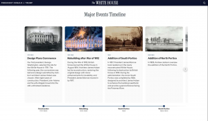 يبدأ الجدول الزمني الرسمي بمرحلة التصميم في أواخر القرن الثامن عشر وحرق القصر من قبل البريطانيين في عام 1814، ويشير أيضاً إلى عملية “تفريغ” مقر إقامة البيت الأبيض بالكامل في عهد إدارة ترومان، وإضافة الجناح الغربي وحديقة الورود والجناح الشرقي الذي تم هدمه الآن في القرن الماضي.