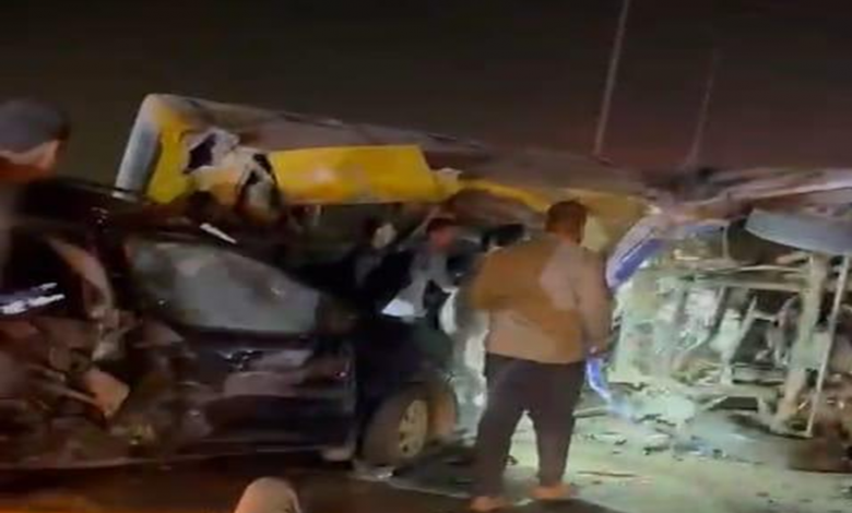 ووقع الحادث المروع على طريق مصر – السويس الصحراوي عند الكيلو 61، بين عدد من السيارات وشاحنة، ما أسفر عن مصرع 7 أشخاص وإصابة 38 من الركاب بينهم 3 حالات حرجة، ونقلت سيارات الإسعاف الجثث والمصابين إلى المستشفيات.