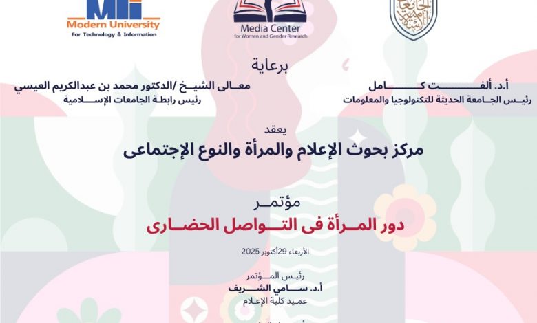 القاهرة:تنطلق يوم الأربعاء فعاليات مؤتمر “دور المرأة في التواصل الحضاري” الذي ينظمه مركز بحوث الإعلام والمرأة والنوع الاجتماعي بكلية الإعلام في الجامعة الحديثة للتكنولوجيا والمعلومات (MTI)، تحت رعاية الأستاذة الدكتورة ألفت كامل رئيس الجامعة، ومعالي الشيخ الدكتور محمد بن عبد الكريم العيسى رئيس رابطة الجامعات الإسلامية.