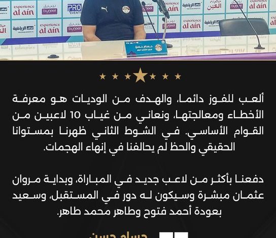 وقال حسام حسن في تصريحات خلال مؤتمر صحفي عقب المباراة: “ألعب للفوز دائما، والهدف من المباريات الودية هو معرفة الأخطاء وعلاجها”.