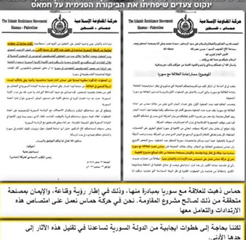 يتداول الإعلام العبري بنهم صوراً ضوئية لما يزعم أنها وثائق حصلت عليها المخابرات العسكرية الإسرائيلية (أمان)، من مخابئ حماس، تكشف عن تعاون الحركة السري مع الرئيس السوري المخلوع بشار الأسد.
