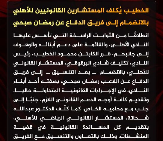 وكان النادي الأهلي قد أعلن في وقت سابق اليوم تكليف مستشاريه القانونيين بالانضمام –بعد تنسيق مسبق– إلى فريق الدفاع عن رمضان صبحي.