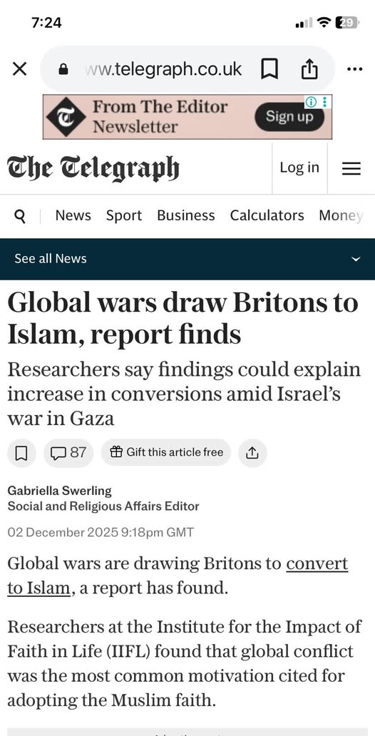 محررة الشؤون الاجتماعية والدينية في الصحيفة، وينقل عن باحثين في معهد تأثير الإيمان على الحياة (IIFL) أن الصراعات العالمية هي الدافع الأكثر شيوعًا الذي يتم الاستشهاد به عند التحول إلى الدين الإسلامي.