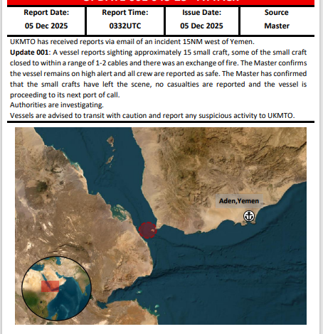وأوضحت الهيئة أن “ربان السفينة التي أبلغت عن واقعة غربي اليمن يقول إنها لا تزال في حالة تأهب وإن جميع أفراد الطاقم بخير”، مشيرة إلى أنها تتابع الحادث، وتدعو السفن في المنطقة إلى توخي الحذر”.