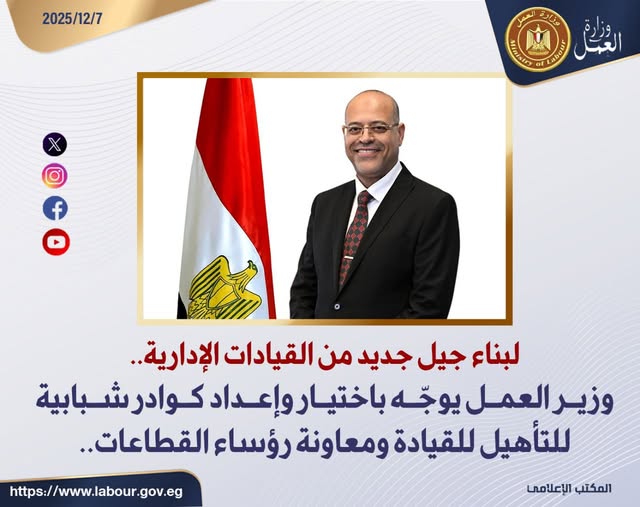 تنفيذًا لتوجيهات القيادة السياسية بدعم تمكين الشباب وبناء جيل جديد من القيادات الإدارية القادرة على مواكبة التطورات الحديثة، وجّه وزير العمل السيد/ محمد جبران، بإطلاق برنامج شامل لاختيار وإعداد كوادر شبابية مؤهلة لتولي مسئوليات قيادية ومعاونة رؤساء القطاعات بالديوان العام للوزارة ومديريات العمل بالمحافظات.