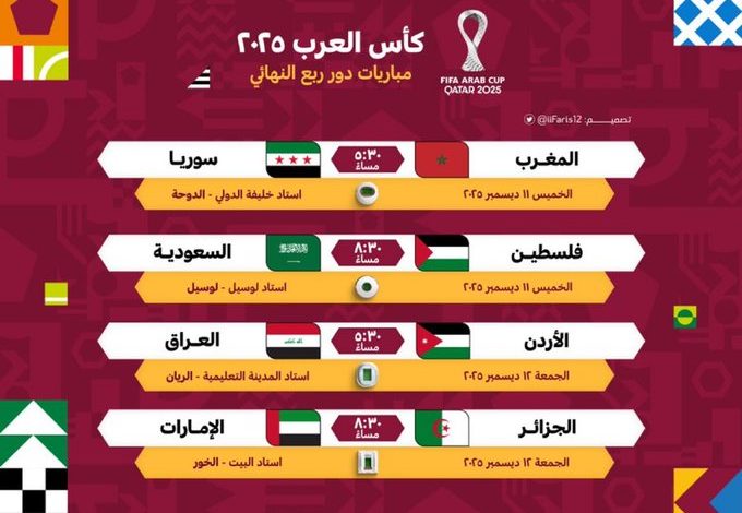مواجهات ومواعيد ربع نهائي كأس العرب 2025: