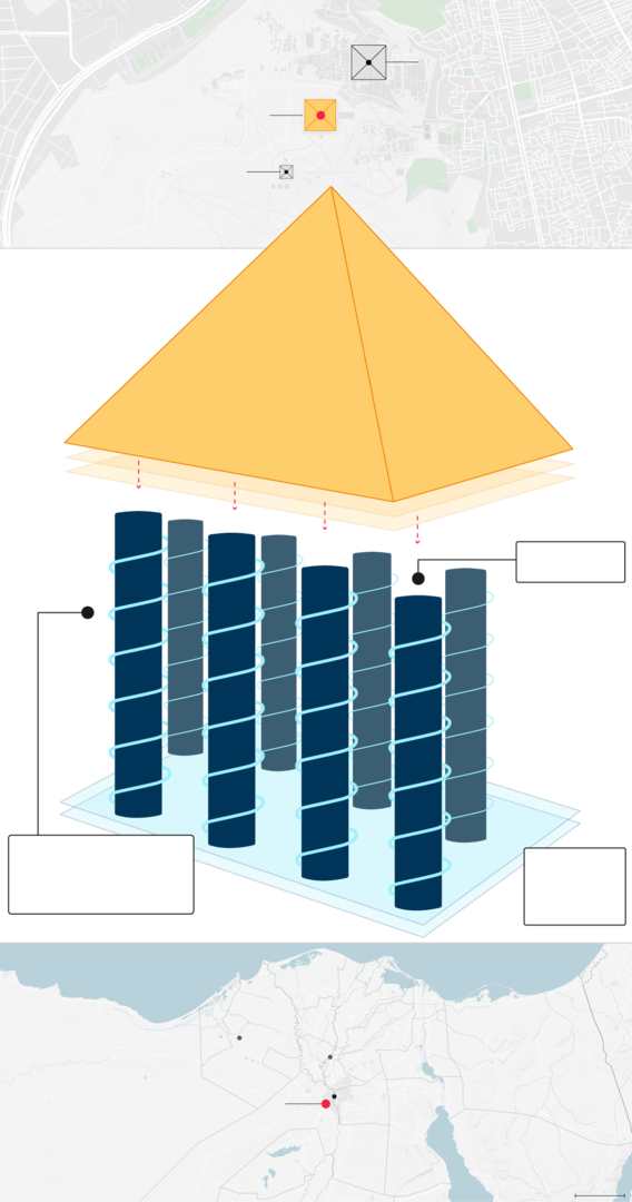 وبحسب تقرير نشرته صحيفة “ديلي ميل” البريطانية، قال فيليبو بيوندي، المهندس المتخصص في الرادار والمسؤول عن المشروع، إن بيانات التصوير المقطعي الراداري التي جمعتها أقمار صناعية تابعة لشركات Umbra وCapella وICEYE وCosmo-SkyMed جاءت متطابقة، حيث أظهرت ما وصفه بأسطوانات عملاقة تنحدر مباشرة أسفل هرم خفرع، لتنتهي بغرف مكعبة تزيد مساحتها على 260 قدمًا مربعًا.