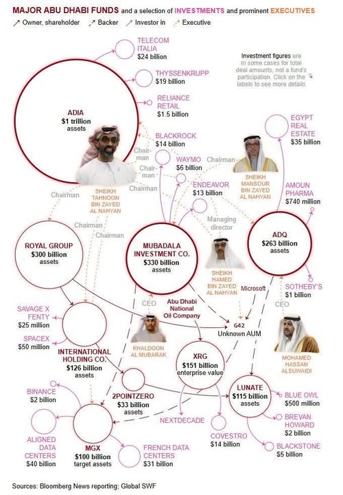 بلومبيرج خريطة القوة بـ 2 تريليون دولار: الكشف عن الشبكة المعقدة التي تحكم إمبراطورية أبوظبي الاستثمارية العالمية!