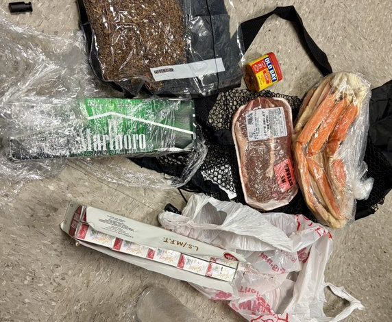 وأظهرت الصور التي التقطها المسؤولون داخل السجن الطرد مع شرائح اللحم في تغليفها الأصلي، وأرجل السلطعون، وتوابل Old Bay، بالإضافة إلى أكياس صغيرة من الماريجوانا وعلبتين من السجائر.