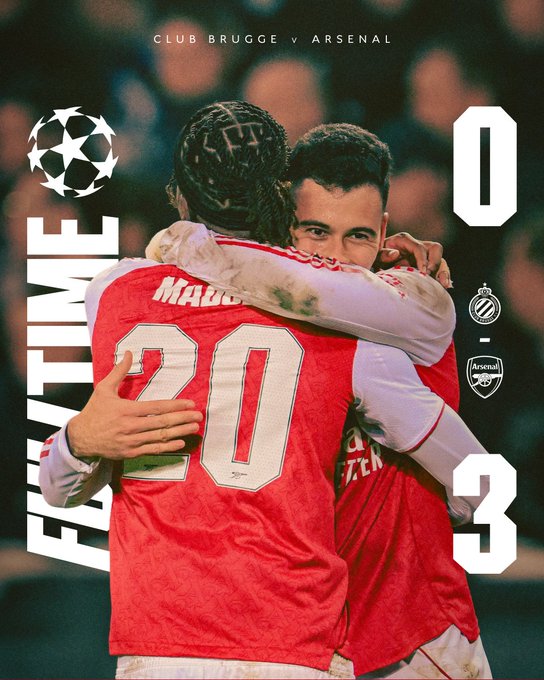 ورفع أرسنال رصيده إلى 18 نقطة بالعلامة الكاملة في صدارة ترتيب مرحلة الدوري بدوري الأبطال، أما كلوب بروج فبقي في المركز الـ31 ولديه 4 نقاط.