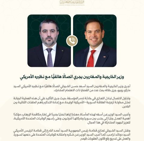 وأوضحت وزارة الخارجية السورية في بيان: “أجرى وزير الخارجية أسعد حسن الشيباني اتصالا هاتفيا مع نظيره الأمريكي ماركو روبيو، جرى خلاله بحث عدد من القضايا ذات الاهتمام المشترك”.