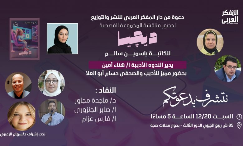 ينظم دار ومنتدى المفكر العربي أمسية أدبية لمناقشة المجموعة القصصية «ديچيا» للكاتبة ياسمين سالم، وذلك يوم السبت المقبل الموافق 20 ديسمبر، بحضور كوكبة من الأدباء والكتاب والمفكرين والمثقفين والإعلاميين.