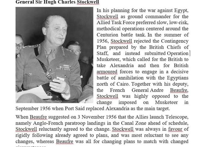 وتأكيدًا لعملية تعديل الخطة، هذا نص ما جاء في أحد كتب التاريخ العسكري البريطاني عن قائد العمليات البريطاني في العدوان الثلاثي السير هيوج ستوكويل (صورة مرفقة):