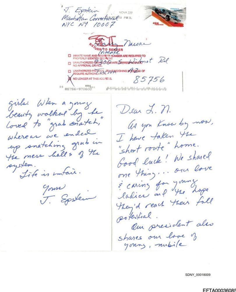 ووُقعت الرسالة بعبارة: “الحياة غير عادلة. المخلص لك، ج. إبستين”.