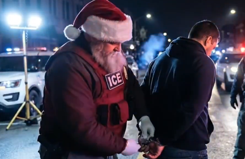 ويعرض المقطع المستوحى من عطلة الأعياد، والذي تم نشره على منصة “إكس” في وقت متأخر من يوم الاثنين، شخصية “سانتا كلوز” ببنية جسدية قوية مرتديا سترة حمراء واقية من الرصاص تحمل شعار “ICE”، وهو يضع الأصفاد في يد مهاجر غير موثق في الشارع.