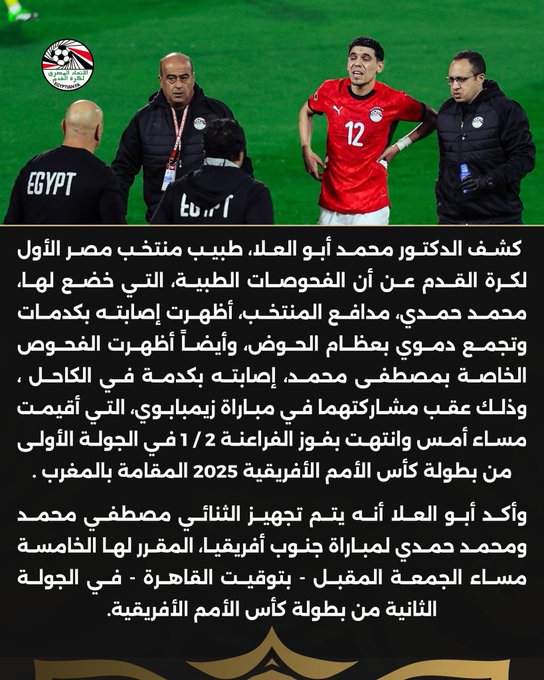 وأوضح أبو العلا في بيان نشره الاتحاد المصري لكرة القدم على حسابه في منصة “إكس” اليوم الثلاثاء، أن الفحوصات الطبية والأشعة التي خضع لها اللاعبان كشفت عن إصابة محمد حمدي بكدمات قوية وتجمع دموي في منطقة عظام الحوض، فيما يعاني مصطفى محمد من كدمة في الكاحل.
