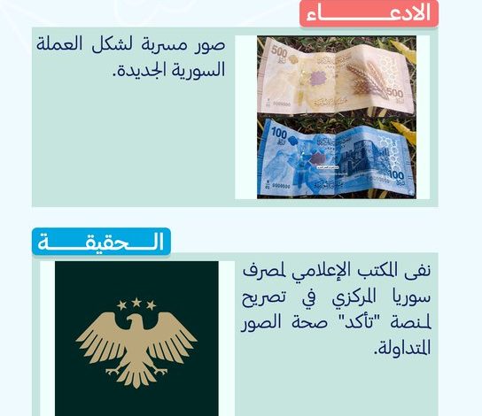ونفى المكتب الإعلامي في مصرف سوريا المركزي لمنصة “تأكد” صحة الصور المتداولة على أنها العملة السورية الجديدة التي أعلن عن موعد إطلاقها من قبل حاكم المصرف في وقت سابق.