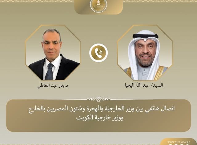 جرى اتصال هاتفي يوم السبت ٢٧ ديسمبر بين د. بدر عبد العاطي وزير الخارجية والهجرة وشئون المصريين بالخارج، والشيخ عبد الله اليحيا وزير خارجية دولة الكويت الشقيقة، في إطار التشاور والتنسيق المستمر بين البلدين الشقيقين.
