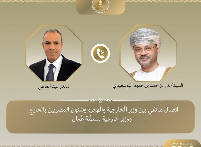 وصرح السفير تميم خلاف المتحدث الرسمى باسم وزارة الخارجية أن الوزير عبد العاطي أكد خلال الاتصال على خصوصية العلاقات بين مصر وعُمان، وما تقوم عليه من روابط أخوية راسخة وتوافق في الرؤى إزاء مختلف القضايا الإقليمية والدولية، مشيراً إلى الحرص المتبادل على الارتقاء بمستوى التعاون الثنائي والبناء على ما تحقق من تطور ملموس خلال الفترة الماضية. كما شدد وزير الخارجية على أهمية مواصلة التنسيق بين البلدين وتكثيف التشاور، وتعزيز التعاون في المجالات الاقتصادية والتجارية والاستثمارية، بما يسهم في تعظيم المصالح المشتركة ويدعم جهود التنمية والاستقرار في البلدين والمنطقة.