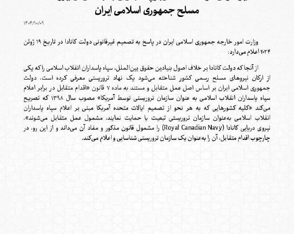أكمل القراءة »وصفت إيران قرار الحكومة الكندية القاضي بتصنيف الحرس الثوري الإيراني “إرهابي” بأنه “غير قانوني”، معلنة تصنيف القوات البحرية الكندية “منظمة…