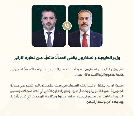 وأضاف البيان: “بحث الوزيران خلال الاتصال آخر التطورات في مدينة حلب، حيث تم التأكيد على سيادة الجمهورية العربية السورية ووحدة أراضيها، وتعزيز التعاون الثنائي في كل المجالات وتنسيق الجهود المشتركة بما يسهم في دعم استقرار سوريا، ومكافحة التهديدات التي تمس أمنها، وبما يخدم أمن واستقرار البلدين”.