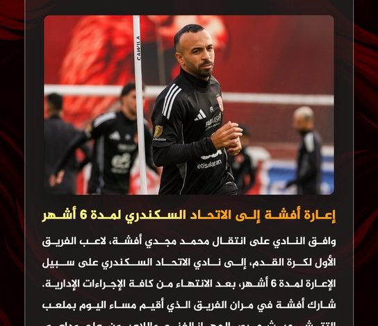 أعلن نادي الأهلي المصري، اليوم الثلاثاء، إعارة لاعبه محمد مجدي “أفشة” إلى صفوف فريق الاتحاد السكندري لكرة القدم، لنهاية الموسم الحالي على سبيل الإعارة.