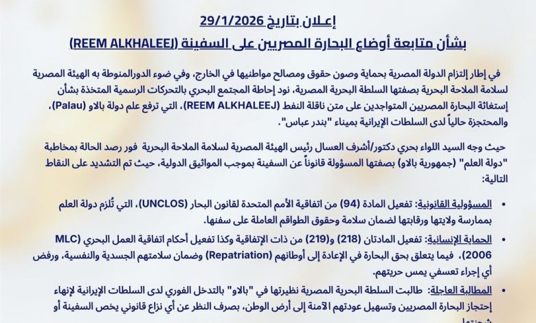 كما طالبت الهيئة المصرية نظيرتها في جمهورية بالاو بالتدخل الفوري والحاسم لدى الجانب الإيراني لإنهاء احتجاز البحارة وتسهيل ترحيلهم، مع التأكيد على ضرورة الفصل الكامل بين وضع الطاقم البشري وأي نزاعات قانونية أو فنية قد تتعلق بالسفينة أو شحنتها، تجسيدًا لمبدأ حماية حقوق الإنسان في العمل البحري.