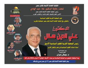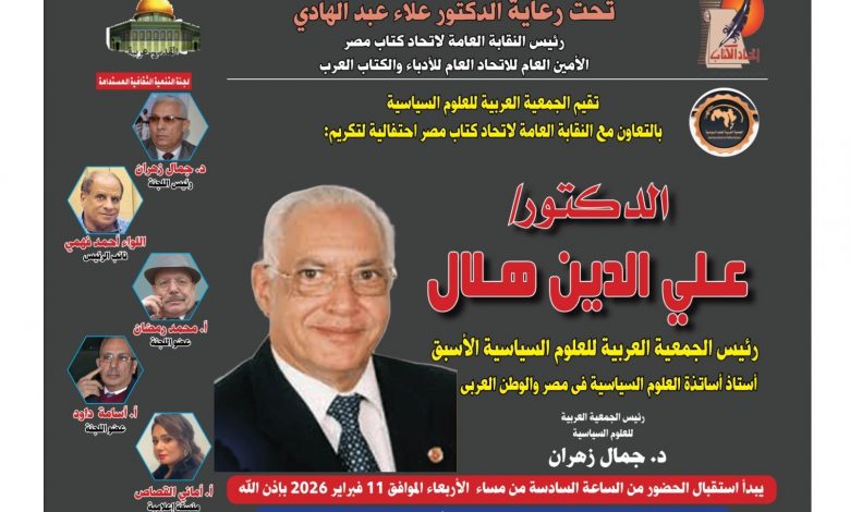 تحت رعاية معالي الدكتور علاء عبد الهادى رئيس النقابة العامة لإتحاد كتاب مصر والأمين العالم للإتحاد العام للأدباء والكتاب العرب والجمعية العربية للعلوم السياسية .. تقيم لجنة التنمية الثقافية برئاسة الدكتور جمال زهران احتفالية لتكريم الدكتور على الدين هلال أستاتذ أساتذة العلوم السياسية فى مصر والوطن العربى، ورئيس الجمعية العربية للعلوم السياسية الأسبق .. والذى تم تكريمة مؤخرا فى لبنان .. حيث قام الدكتور جمال زهران الرئيس الحالي للجمعية العربية للعلوم السياسية .. بإستلام درع التكريم نيابة عنه فى بيروت.. وسوف يقوم بتسليمه له أثناء الإحتفاء به كما سيقوم الدكتور علاء عبد الهادي بتكريمة بدرع خاص من النقابة بوبصفته عضو تحكيم جائزة طه حسين بالنقابة .. ذلك بحضور نخبة من المثقفين والسياسيين وتلاميذ الدكتور هلال . وذلك : فى تمام السادسة مساء غدا الأربعاء الموافق 11 فبراير 2026 بمقر النقابة العامة لإتحاد كتاب مصر 11 ش حسن صبرى بالزمالك