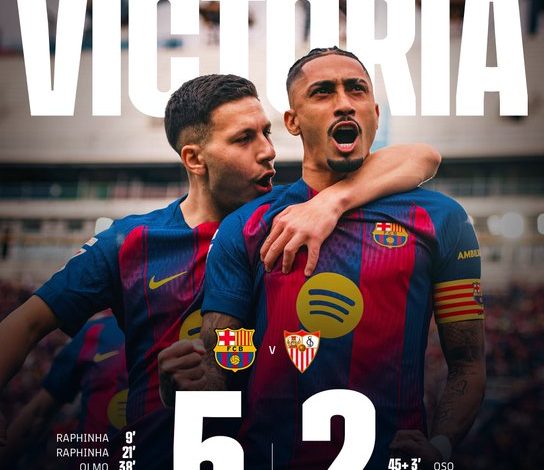 فاز فريق برشلونة على ضيفه إشبيلية (5-2) في المباراة التي جمعتهما مساء اليوم الأحد، وذلك في إطار منافسات الجولة الثامنة والعشرين من الدوري الإسباني لكرة القدم.
