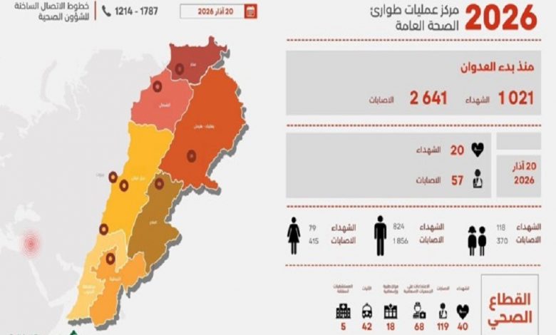 الصحة اللبنانية: ارتفاع حصيلة ضحايا العدوان الإسرائيلي على لبنان إلى 1021 قتيلا و2641 جريحا