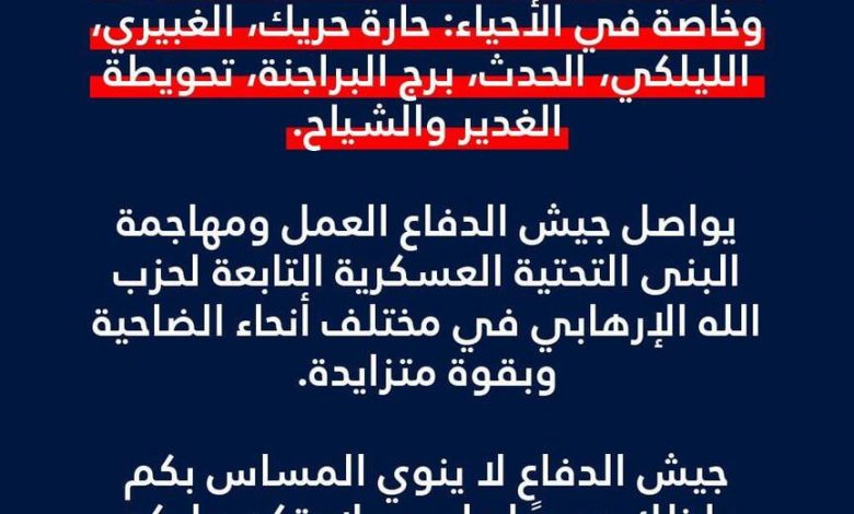وأضاف البيان: “يواصل جيش الدفاع العمل ومهاجمة البنى التحتية العسكرية التابعة لحزب الله الإرهابي في مختلف أنحاء الضاحية وبقوة متزايدة”.