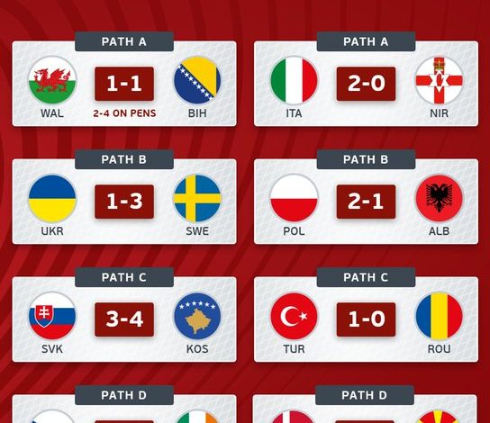 وأسفرت مباريات الملحق الأوروبي المؤهل لمونديال 2026 عن النتائج التالية:
