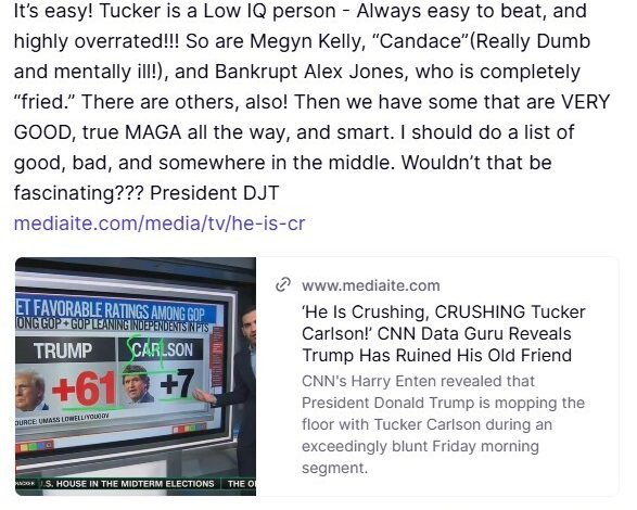 وقال ترامب في منشور له إنه من السهل دائما التغلب على الإعلامي تاكر كارلسون ووصفه بأنه شخص منخفض الذكاء ومبالغ في تقديره بشكل كبير، مشيرا إلى أنه سيهاجم أيضا ميغين كيلي وكانديس أوينز التي وصفها بأنها غبية جدا وتعاني من اضطراب عقلي، إضافة إلى أليكس جونز المفلس الذي قال إنه “احترق” تماما.