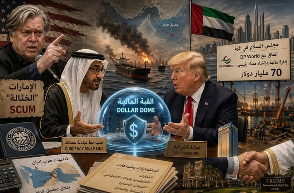 يفتح دونالد ترمب أبواب الخزنة الأمريكية على مصراعيها أمام الإمارات، معبّرًا عن “صدمته” من هشاشة وضعها المالي. فيشتعل غضب بعض المقربين في إدارته، مثل ‘ستيف بانون’ الذي يرى في هذا الدعم المالي تعارضًا مع مبدأ “أميركا أولا” وخضوعًا لانتهازية حليفٍ ثري لكنه “حثالة”. وبالتوازي، تتقاطع تلميحات الإعلام واستنتاجات المحللين بأن قرارات ترمب لا تنفصل عن مصالحه الشخصية والعائلية مع حكام أبوظبي ودبي، مع المتداول عن صفقة “مجلس السلام” في غزة “المليارية” لشركة موانئ دبي العالمية باعتبارها مجرد حلقة في محاولة أوسع لـ“تعويض” الإمارات عن خسائر الحرب مع إيران وإغلاق مضيق هرمز (ولو على حساب الفلسطينيين).