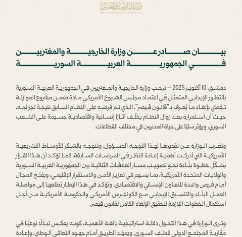 رحبت الخارجية السورية بقرار مجلس الشيوخ الأمريكي تضمين مشروع الموازنة بندا يقضي بإلغاء ما يُعرف بـ”قانون قيصر”، مؤكدة أنها خطوة…