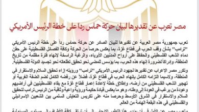 أعربت جمهورية مصر العربية عن تقديرها للبيان الصادر عن حركة “حماس” ردا على خطة الرئيس الأمريكي دونالد ترامب بشأن وقف…