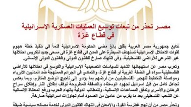تتابع جمهورية مصر العربية بقلق بالغ مضي الحكومة الاسرائيلية قدماً في تنفيذ خطة هجوم لقوات الاحتلال الإسرائيلية تستهدف السيطرة على…