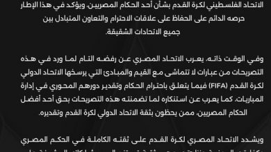 أعرب الاتحاد المصري لكرة القدم عن استغرابه واستنكاره للتصريحات التي أدلى بها جبريل الرجوب، رئيس الاتحاد الفلسطيني لكرة القدم، ضد…